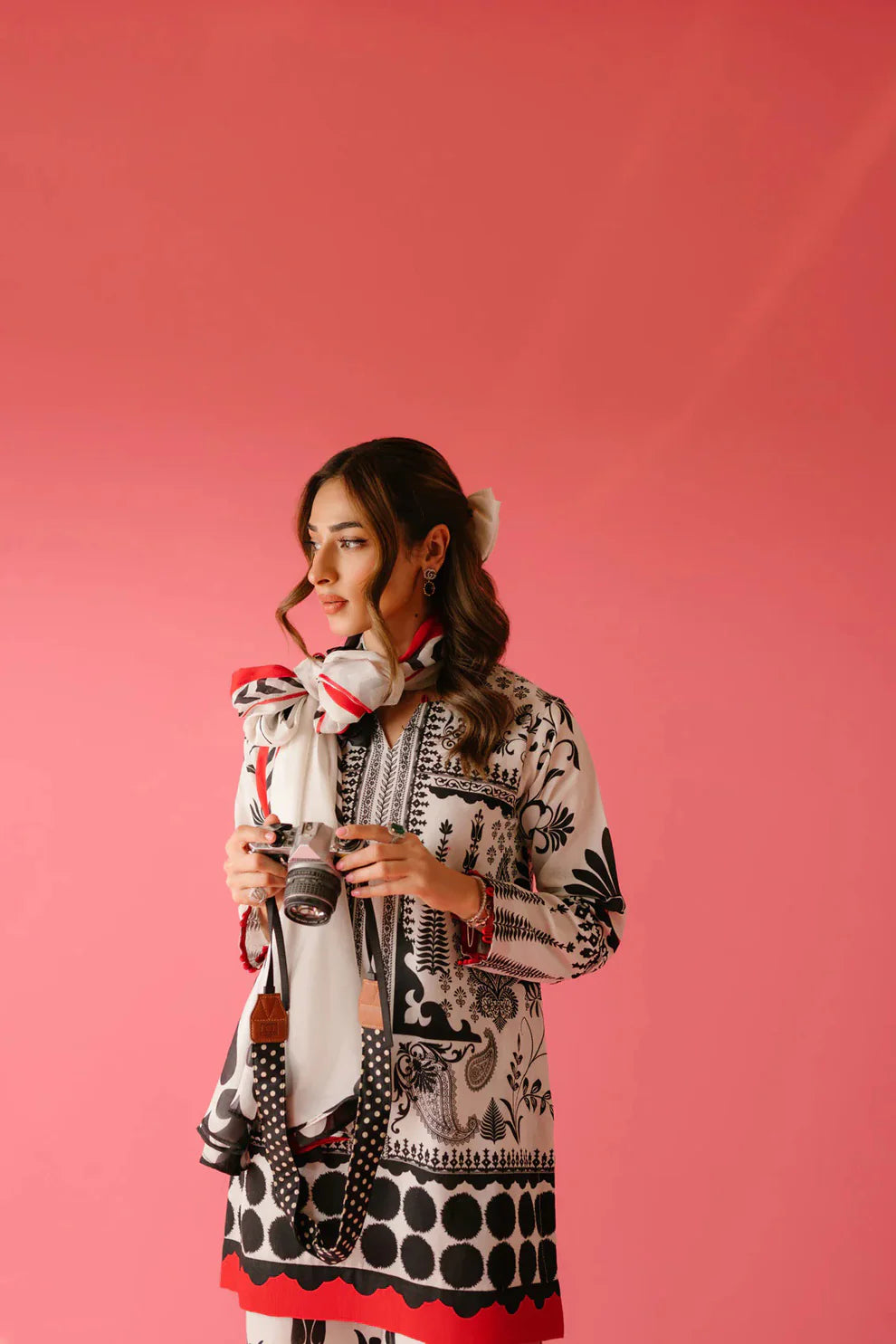 Meet the Monochrome Muse, a striking 3-piece co-ord set that blends modern geometric precision with cultural elegance. Featuring bold black-on-ivory motifs, hints of vibrant red, and a carefully coordinated dupatta, this ensemble is your perfect pick for festive brunches, artistic events, or statement daywear.